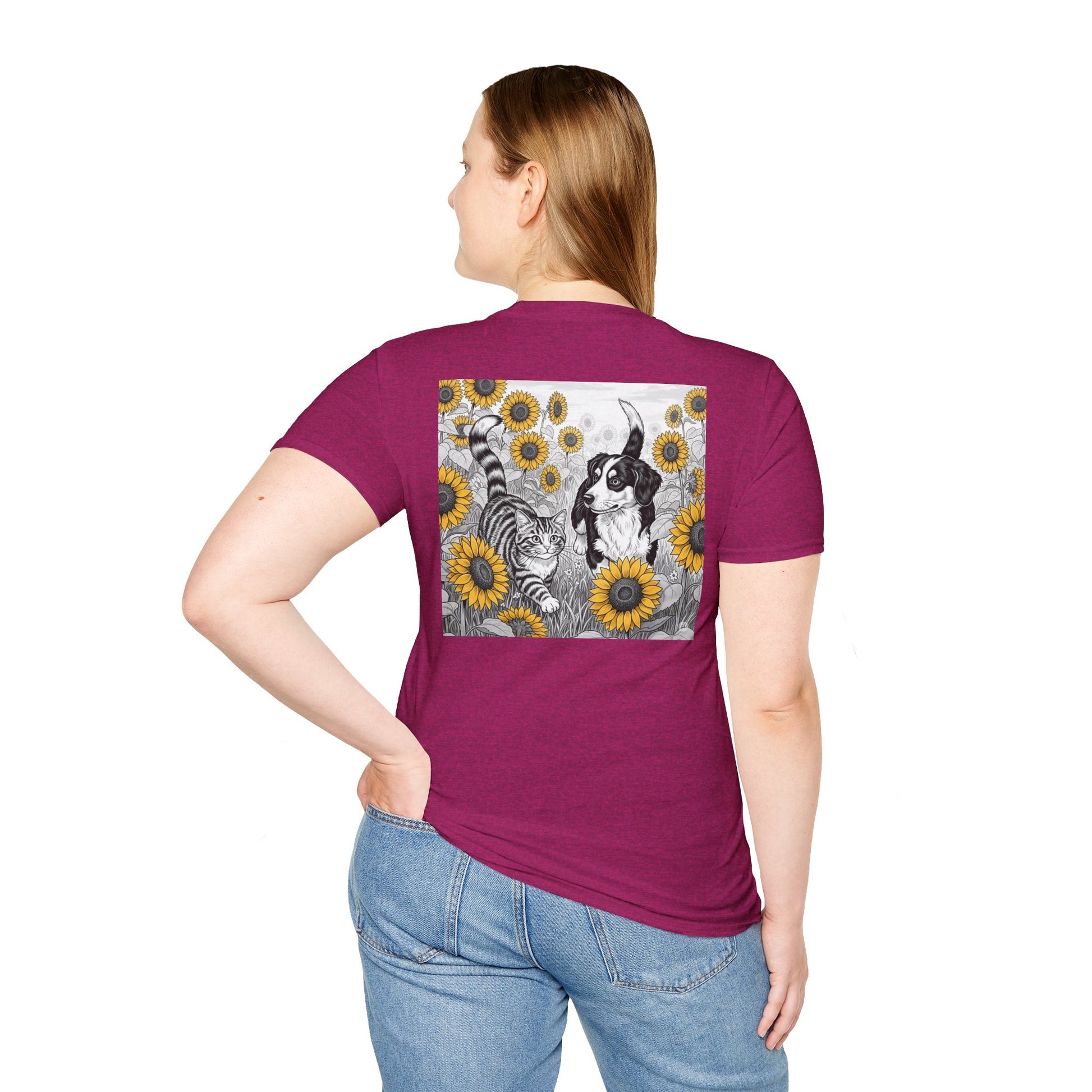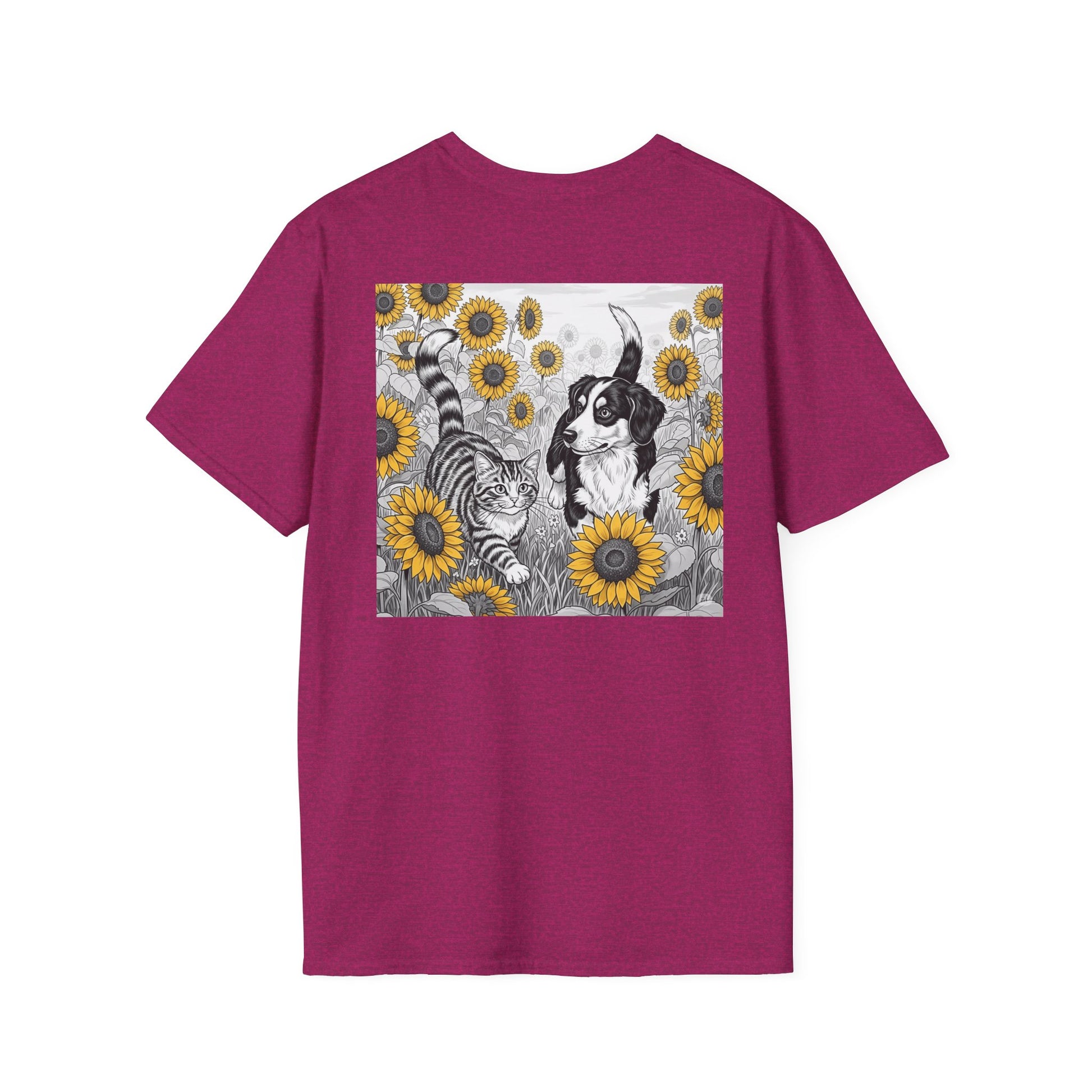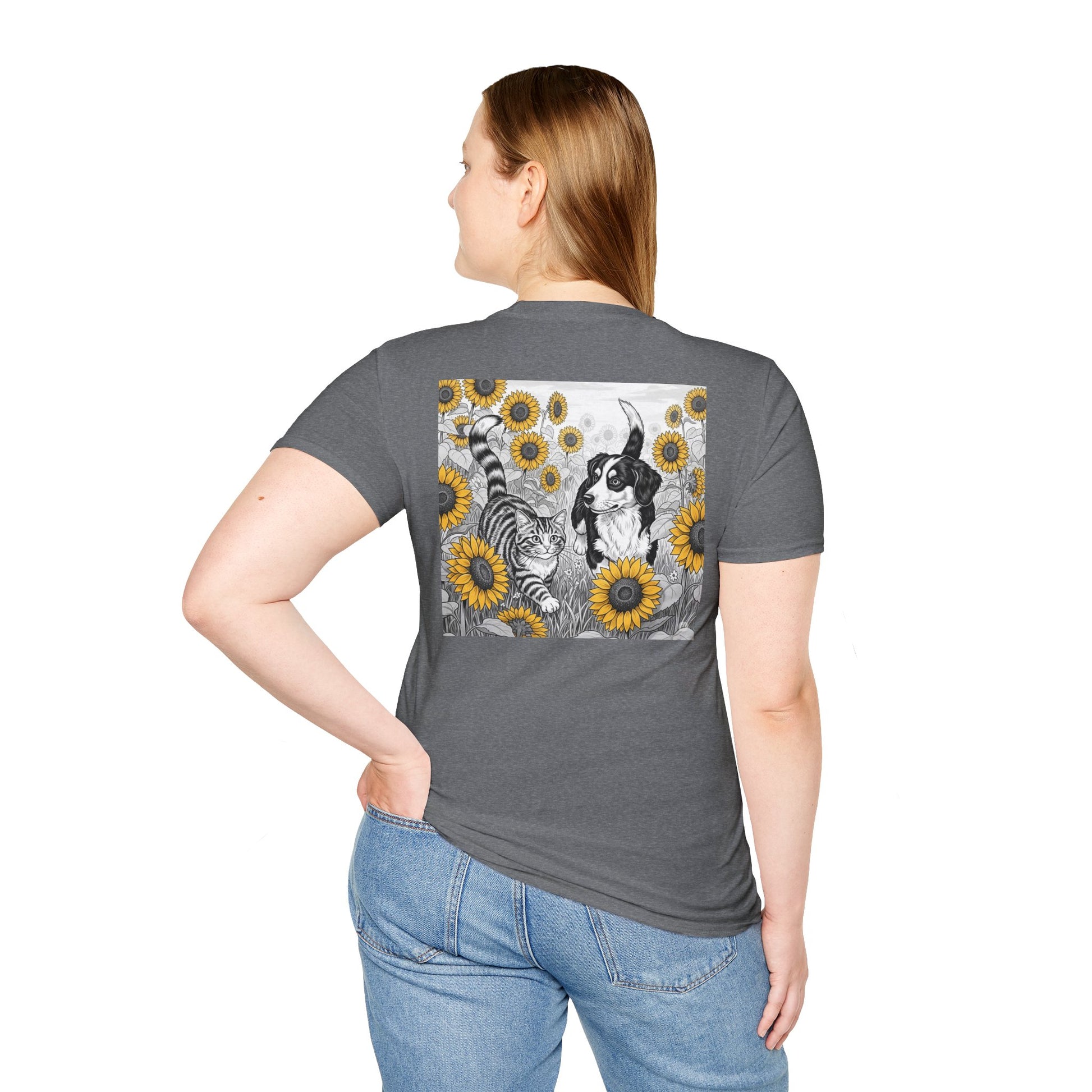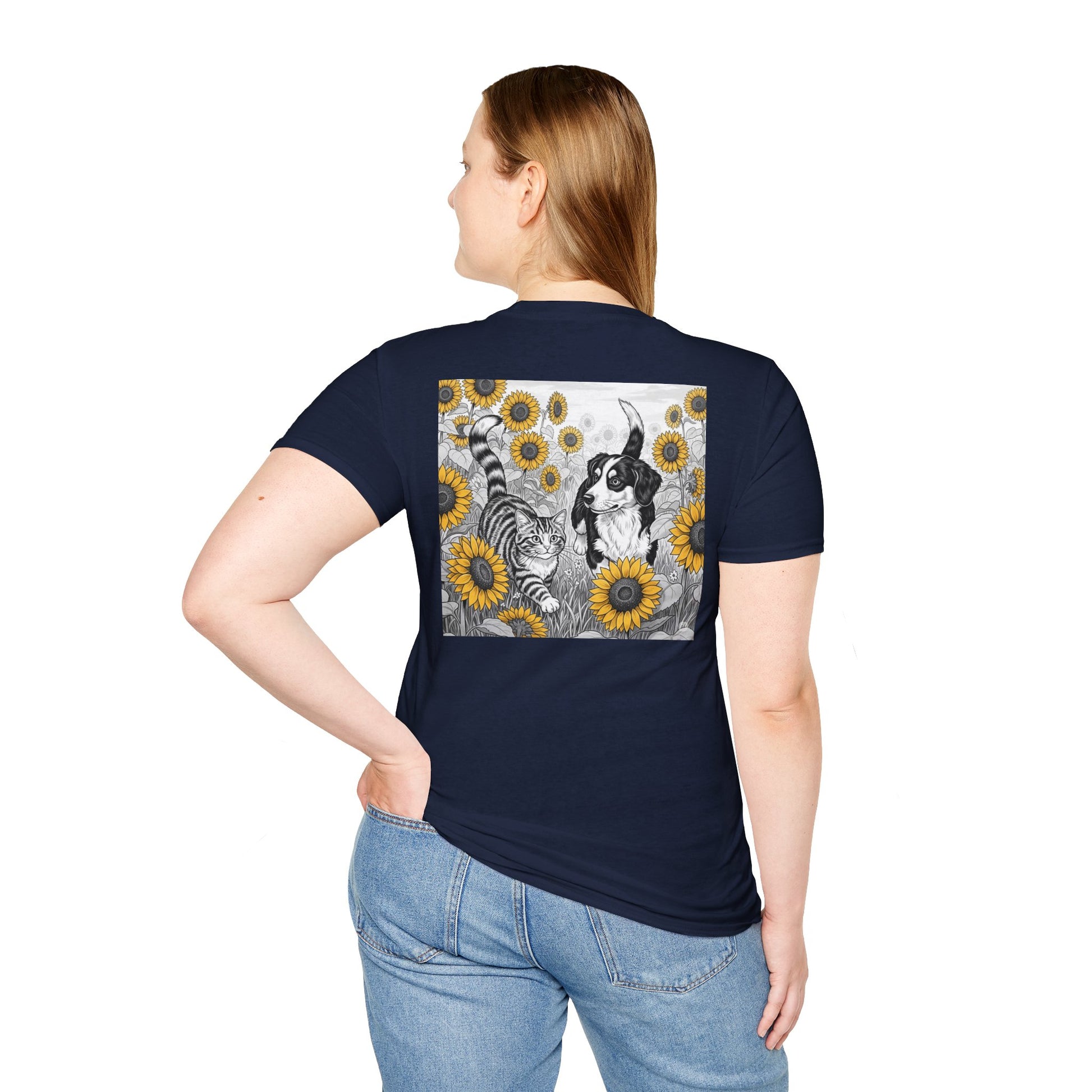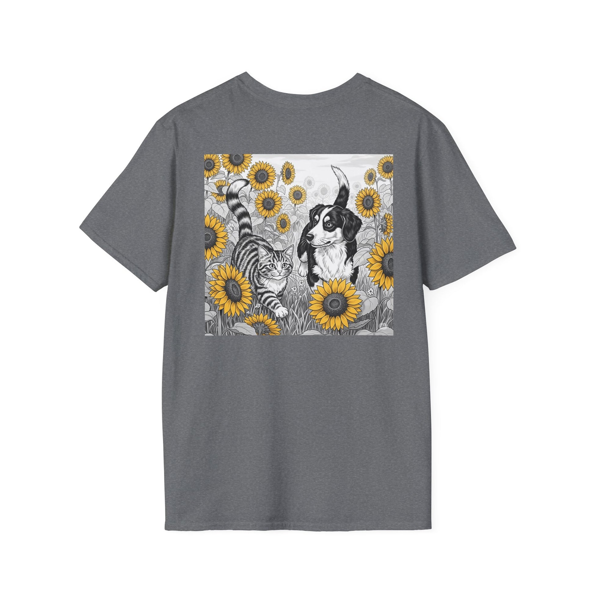 This unisex t-shirt is the perfect blend of comfort and style, making it a versatile addition to any wardrobe. Its lightweight fabric feels soft against the skin, ideal for all-day wear, whether you're lounging at home or out with friends. The modern design, featuring a unique graphic of playful pets among vibrant sunflowers, brings a cheerful and friendly vibe, making it a lovely statement piece for animal lovers. Celebrate your love for pets during any casual occasion or informal gathering. Perfect for birthdays, holidays, or simply as a delightful gift for the animal enthusiast in your life!