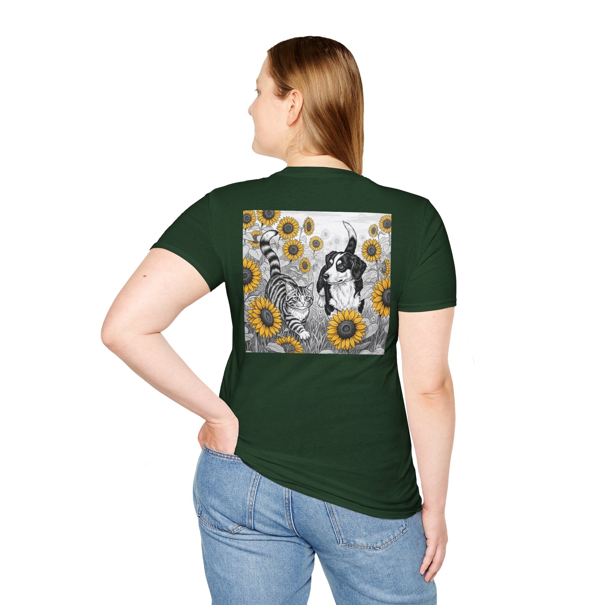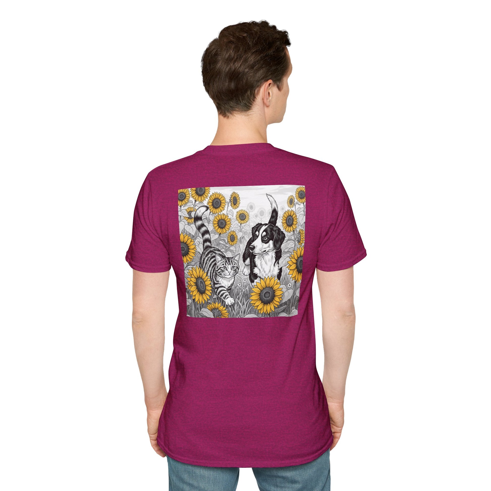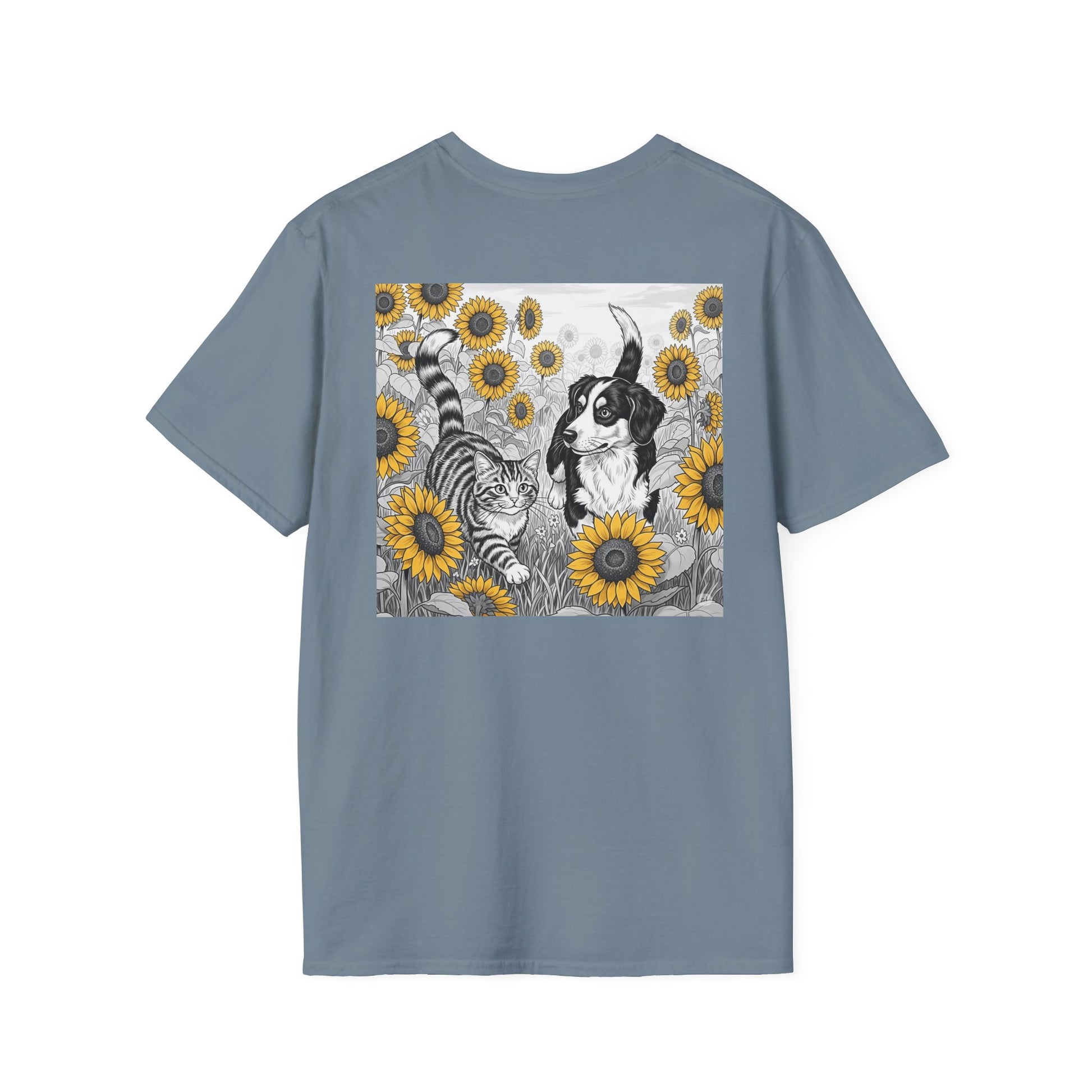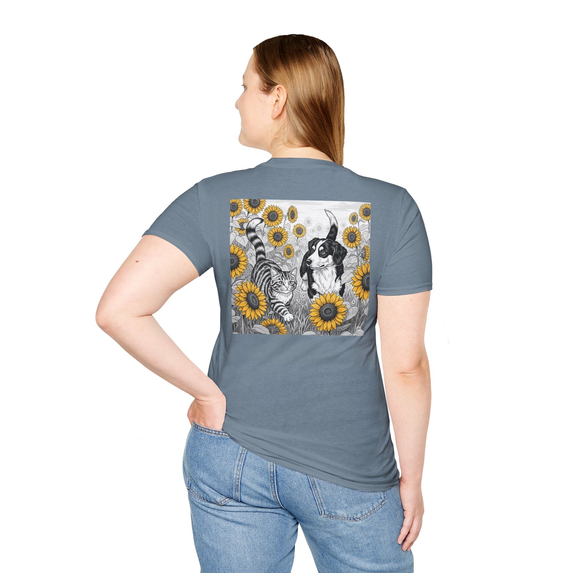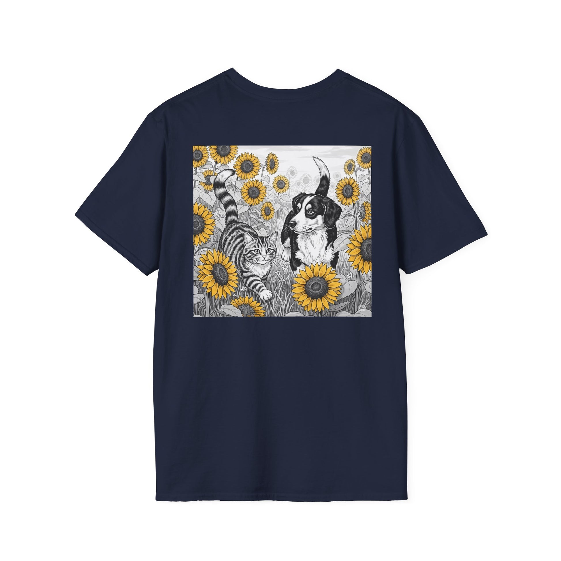 This unisex t-shirt is the perfect blend of comfort and style, making it a versatile addition to any wardrobe. Its lightweight fabric feels soft against the skin, ideal for all-day wear, whether you're lounging at home or out with friends. The modern design, featuring a unique graphic of playful pets among vibrant sunflowers, brings a cheerful and friendly vibe, making it a lovely statement piece for animal lovers. Celebrate your love for pets during any casual occasion or informal gathering. Perfect for birthdays, holidays, or simply as a delightful gift for the animal enthusiast in your life!
